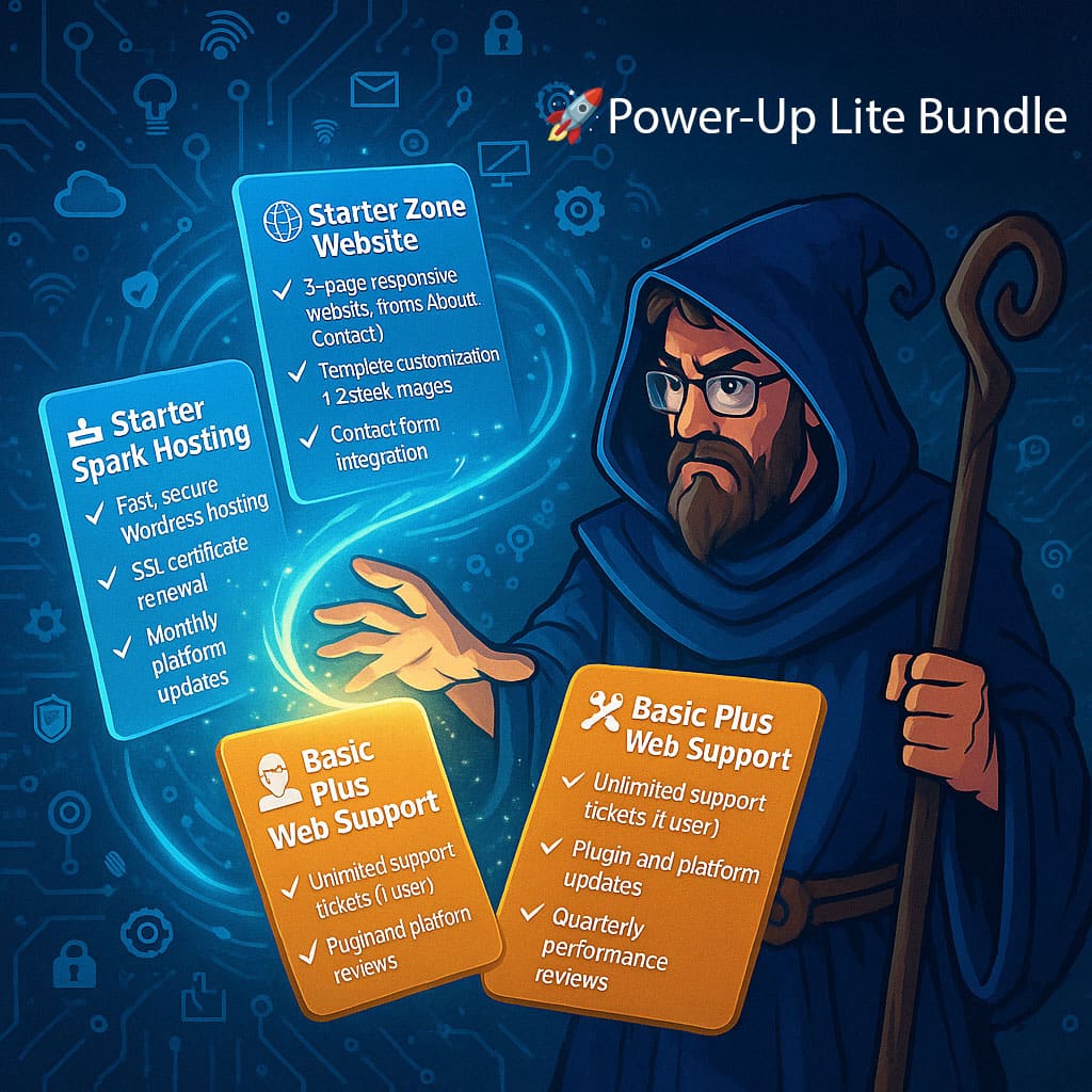 The Power-Up Lite Bundle gives you everything you need to launch your web presence — a fully built site, hosting, and expert support for a full year — all for a one-time price.